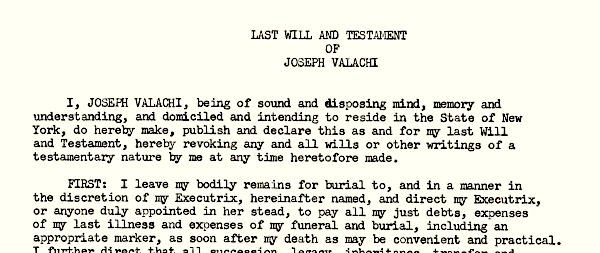 Joseph Valachi composed his latest will and his will in the spring of 1967, while he was part of the Federal Correctional Establishment of Milan, Michigan. Unlike the extraordinarily long autobiography he wrote in 1964-1965, the will was only a page and a half. It was written about a year after Valachi – desperately unhappy with his transfer to Milan and the withdrawal of the government of permission to publish his book – tried to commit suicide. The bruises he suffered in the attenuated suspension had healed, and the author Peter Maas advanced with plans to publish the story of Valachi, but the famous informant was always death in his mind …