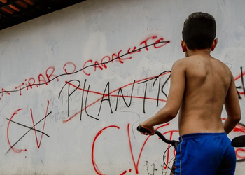 Characteristic image: Child looks at Wall in Ceará with graffiti of criminal organizations marking their territory. Credit: o POVO